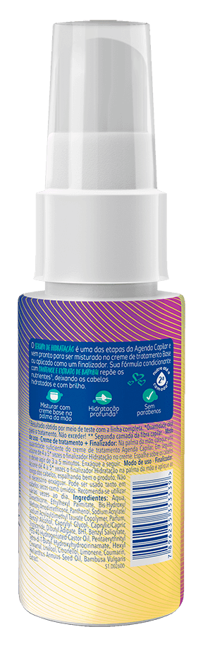 O Sérum de Hidratação é uma das etapas da Agenda Capilar e vem pronto para ser misturado no creme de tratamento Base ou aplicado como um finalizador. Sua fórmula condicionante com pantenol e extrato de bambu repõe os nutrientes, deixando os cabelos hidratados e com brilho.
