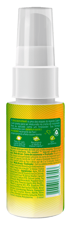 O Spray de Reconstrução é uma das etapas da Agenda Capilar e vem pronto para ser misturado no creme de tratamento Base como um finalizador. Sua fórmula condicionante com queratina vegetal e aminoácidos reconstrói os fios, proporcionando efeito cauterizante.